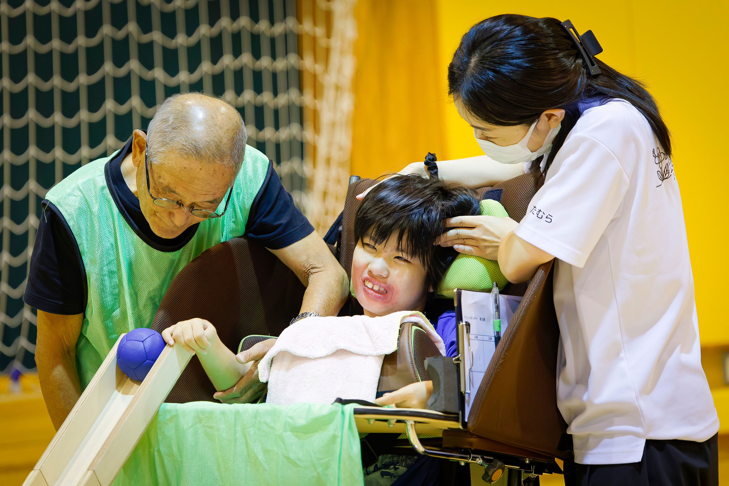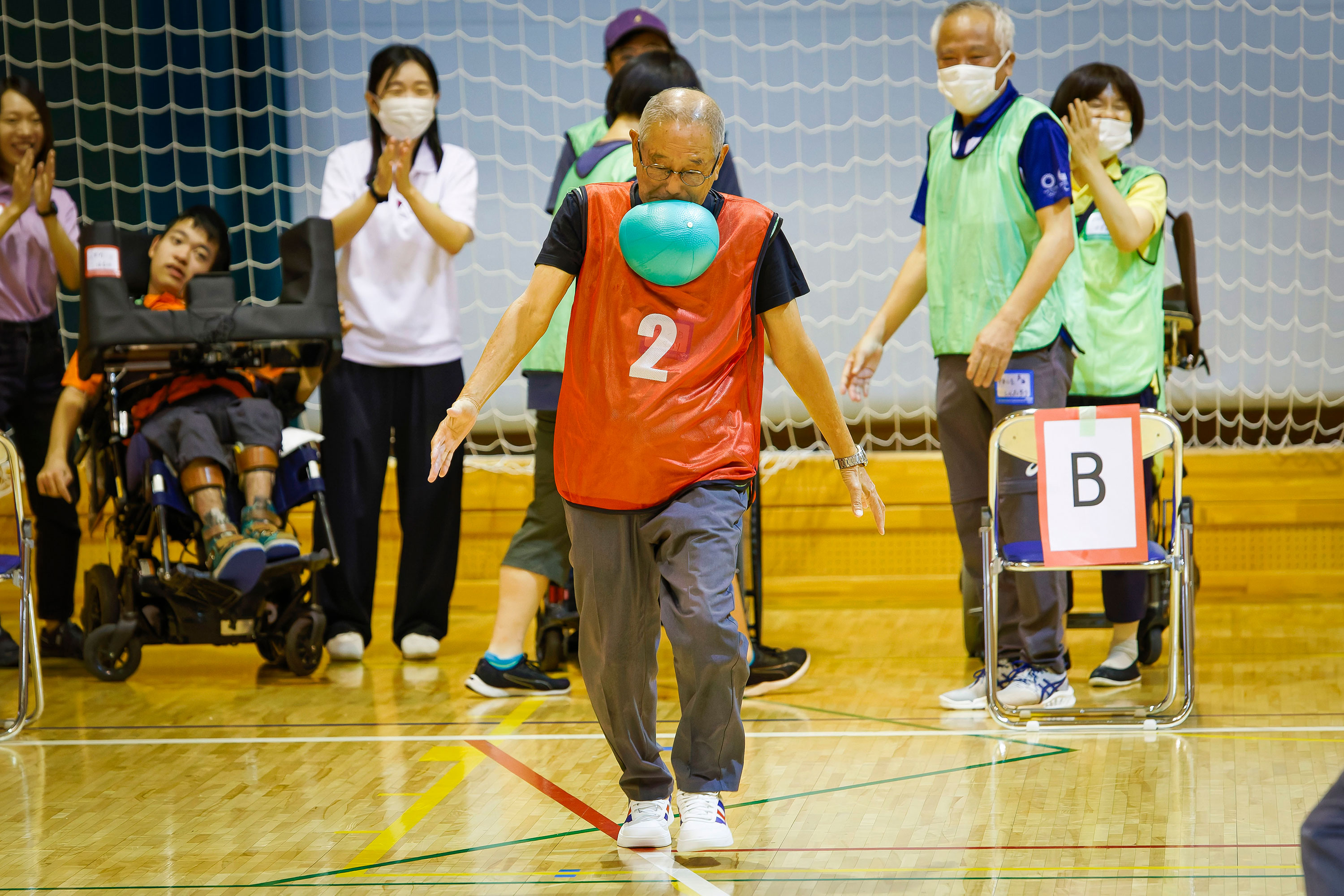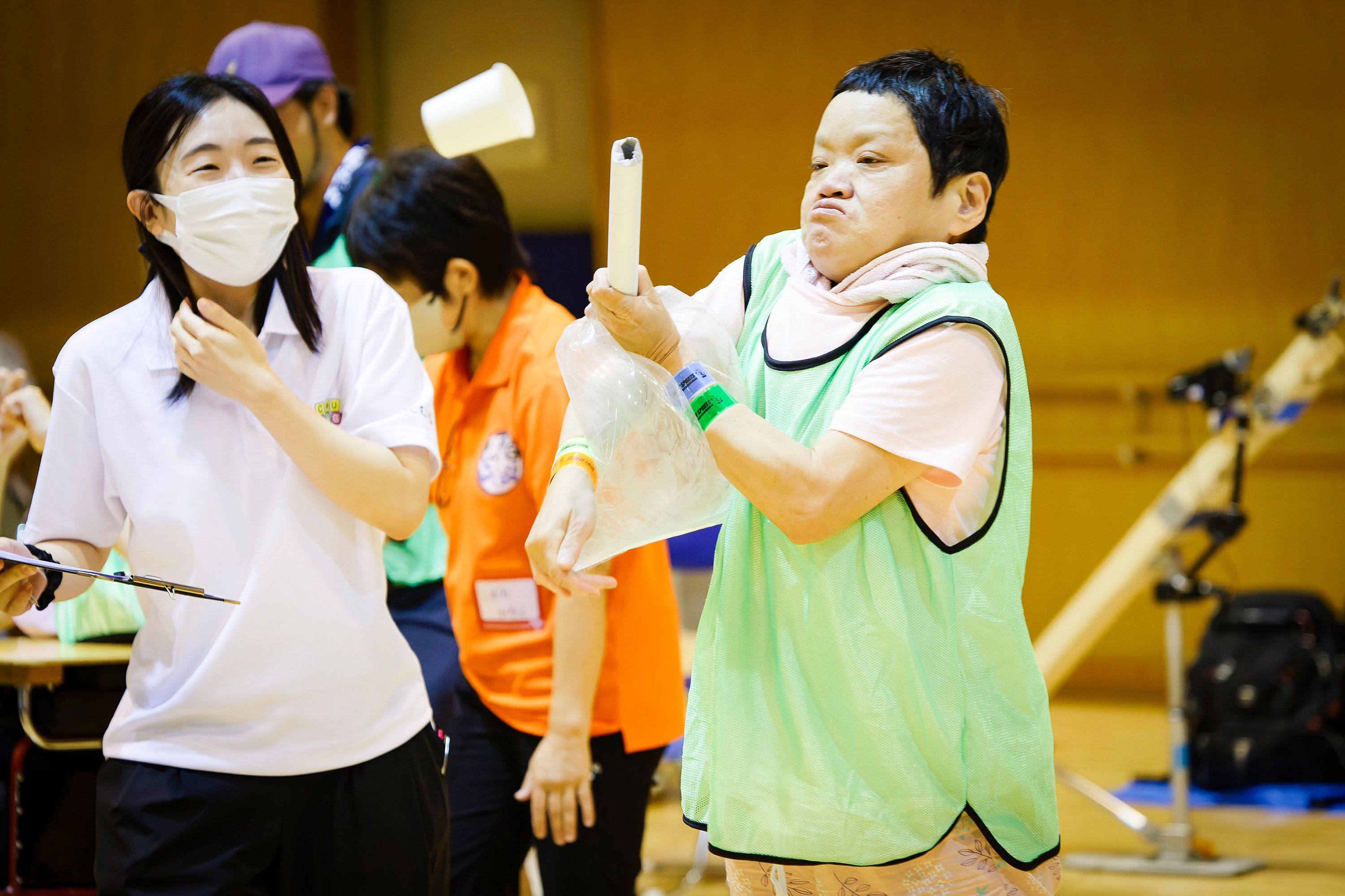 「紙コップ飛ばし」は細長い筒の先端にかぶせた紙コップを、もう一方の先端に付けたビニール袋を勢いよく手で叩くようにして空気を押し出して飛ばす競技。どのチームもどうすればうまく空気を入れられるかなど工夫し合う様子が見られた。「アレンジボッチャ」は、円の中心から3、2、1と数字が書かれた的をめがけて1人2個のマイボールを投げ込み、その合計得点を競う。ボランティアの手厚いサポートのもと「ランプ」を使ってボールを転がしたり、自分の手で勢いよく投げ入れたりと、好きな方法とタイミングで楽しんだ。