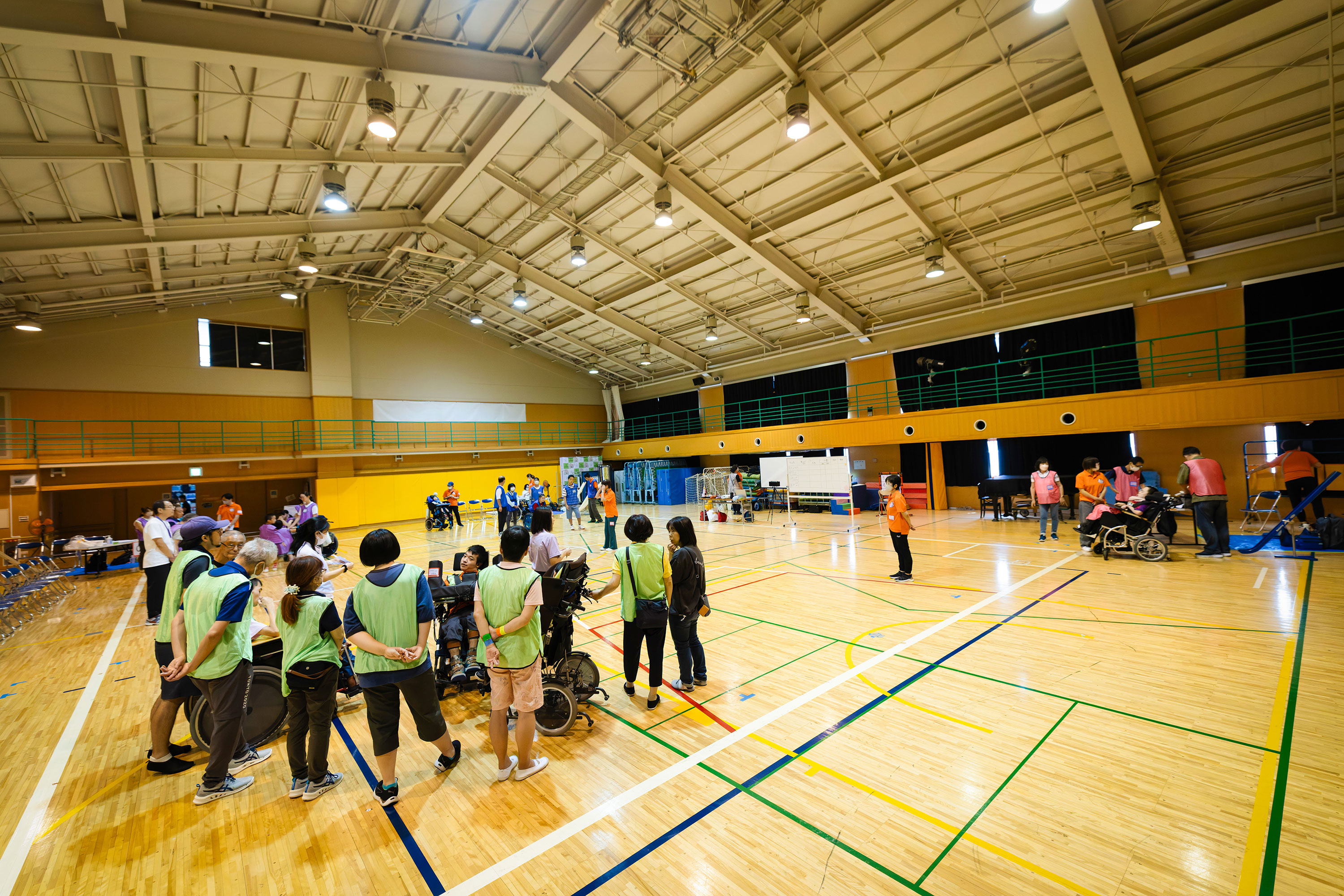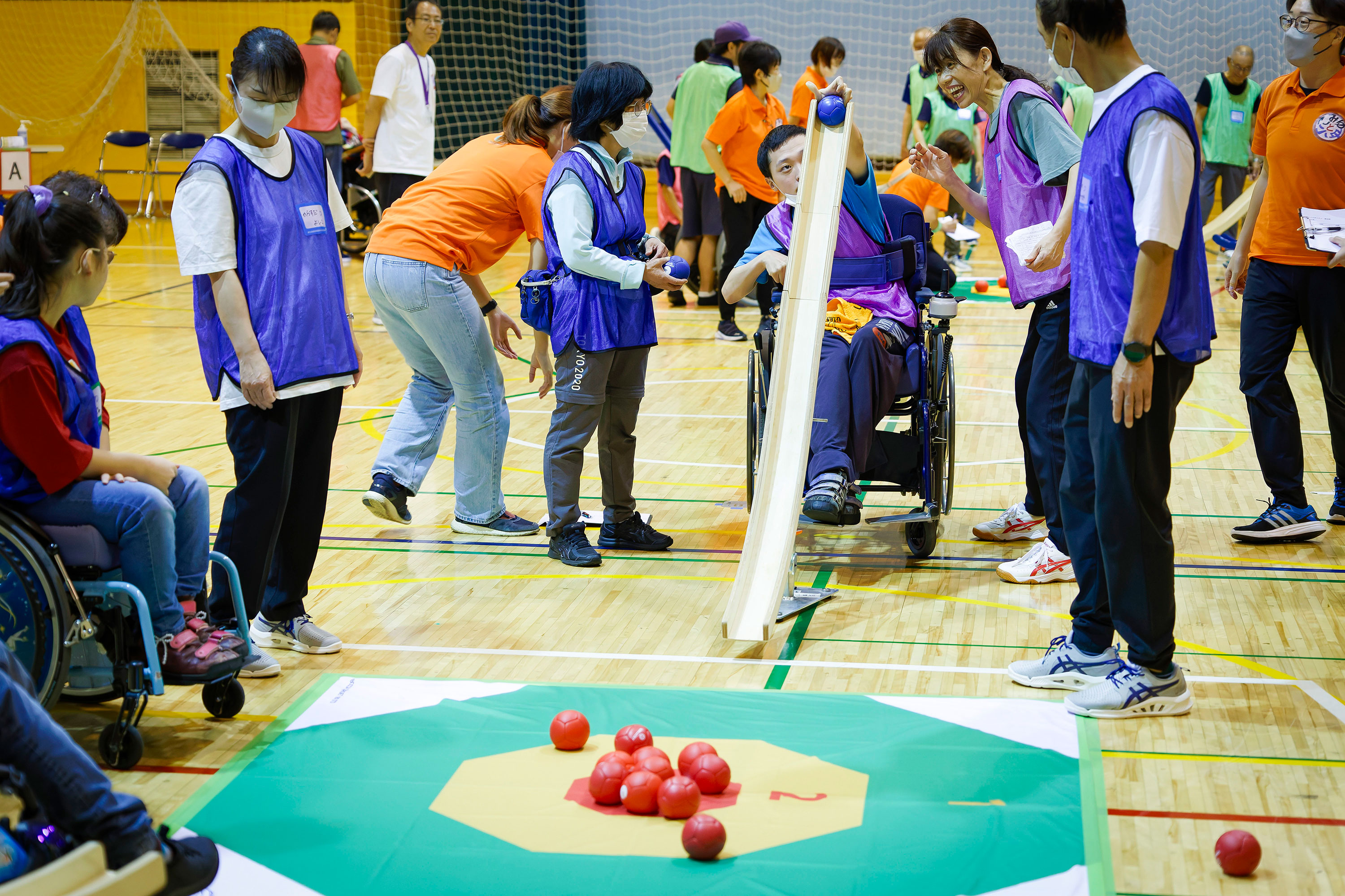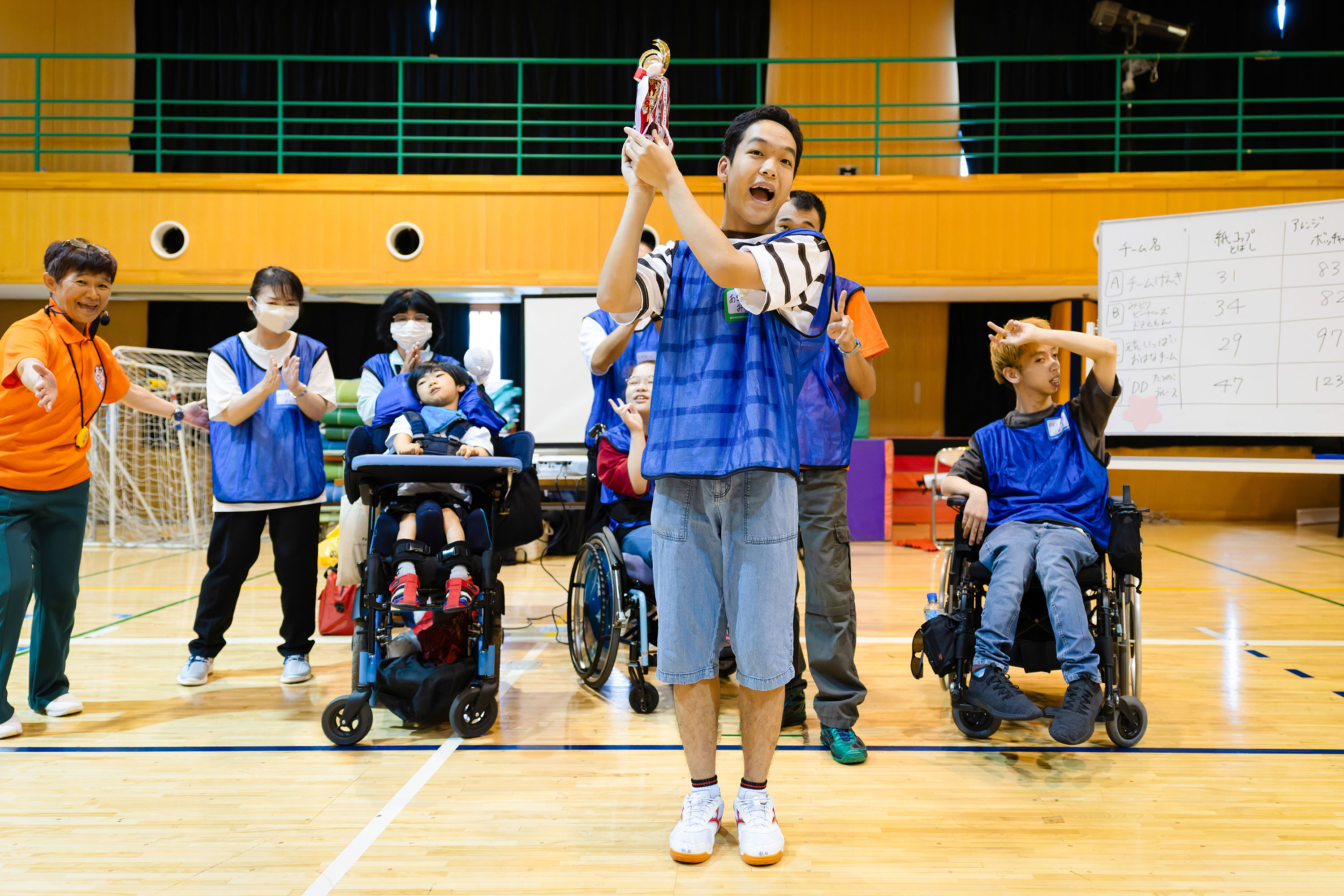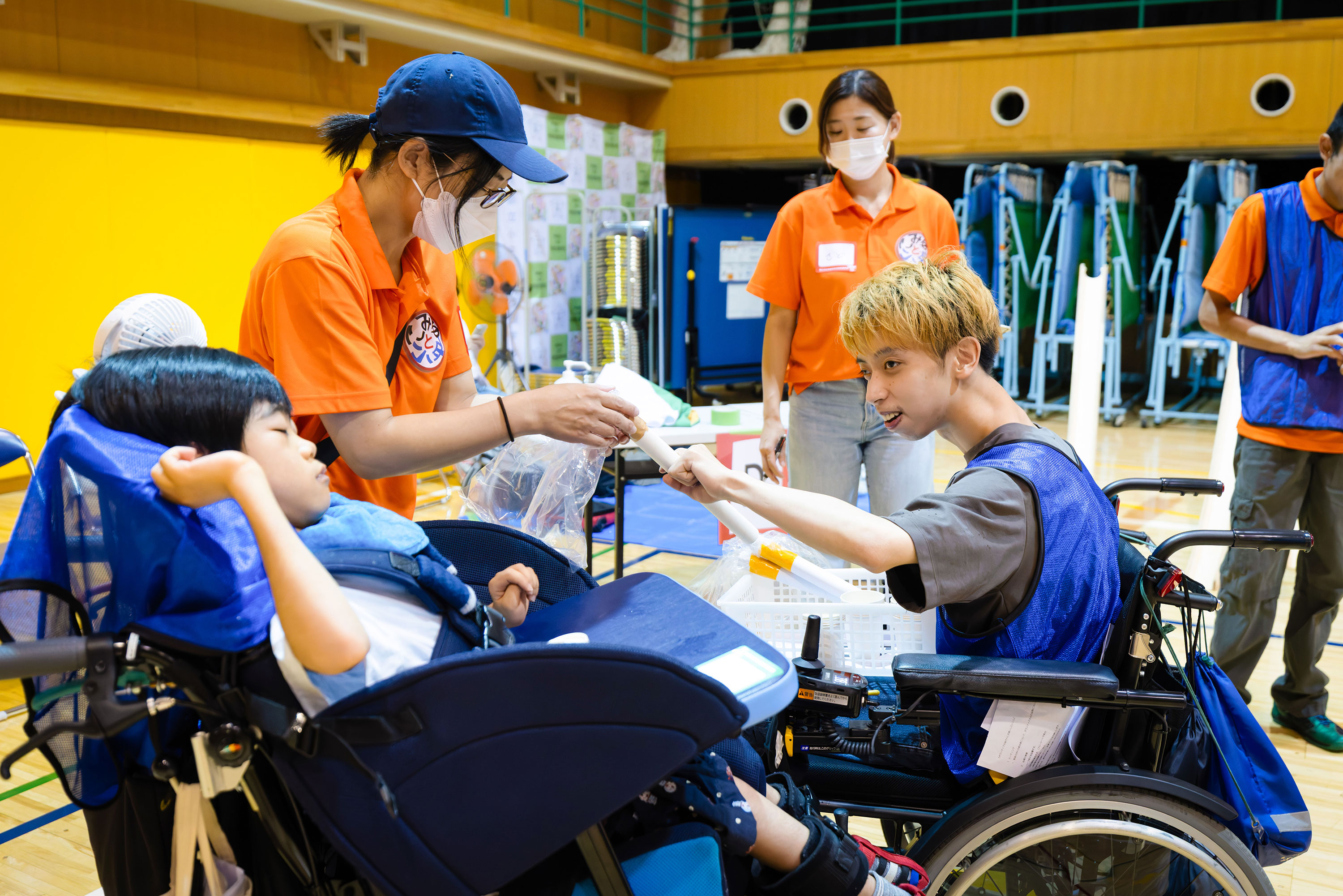 「紙コップ飛ばし」は細長い筒の先端にかぶせた紙コップを、もう一方の先端に付けたビニール袋を勢いよく手で叩くようにして空気を押し出して飛ばす競技。どのチームもどうすればうまく空気を入れられるかなど工夫し合う様子が見られた。「アレンジボッチャ」は、円の中心から3、2、1と数字が書かれた的をめがけて1人2個のマイボールを投げ込み、その合計得点を競う。ボランティアの手厚いサポートのもと「ランプ」を使ってボールを転がしたり、自分の手で勢いよく投げ入れたりと、好きな方法とタイミングで楽しんだ。