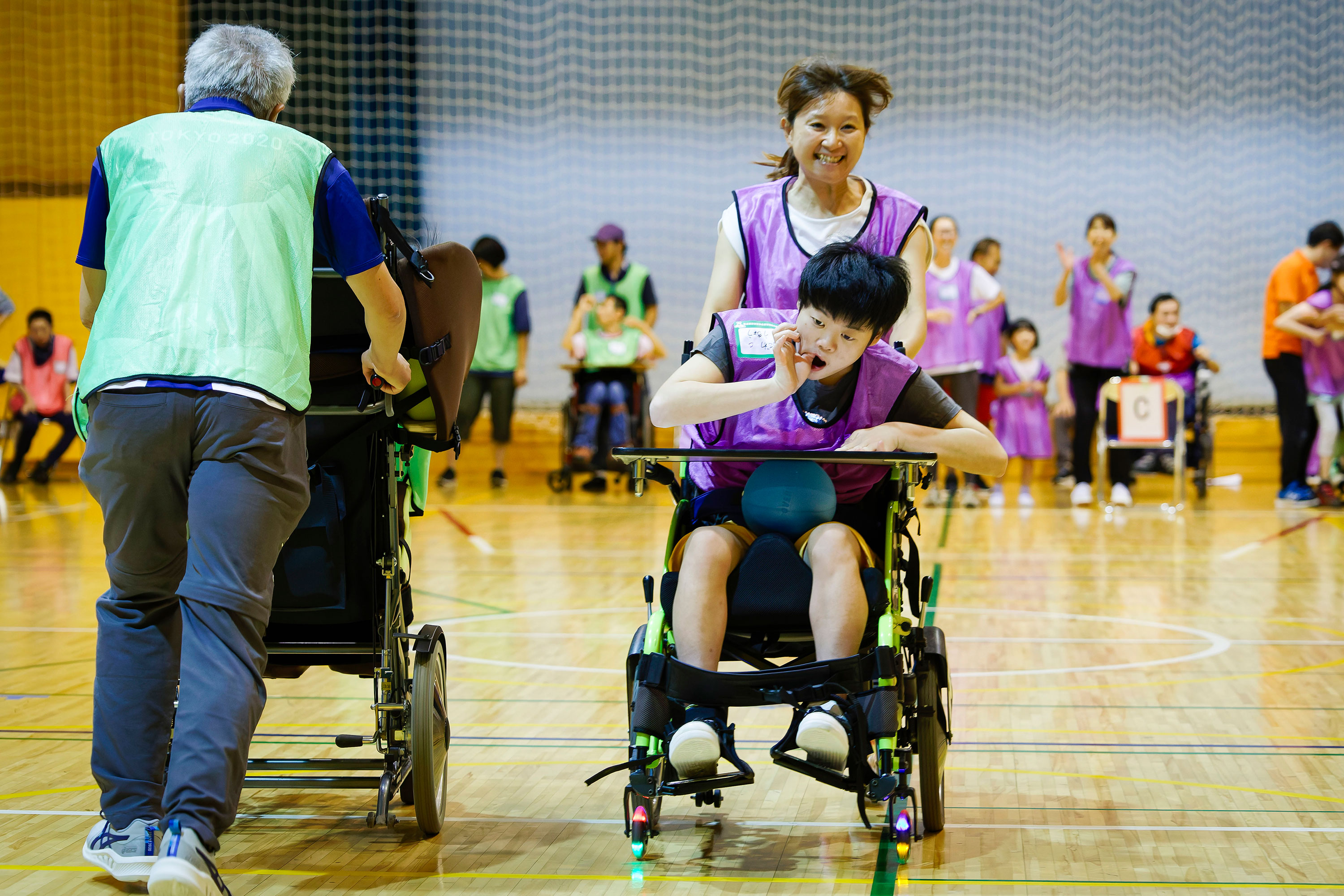 最後の「ボール運びリレー」では、走り終えたら次の走者にボールを渡し、チームで速さを競い合った。ボールを膝の上に置きながら自分で車いすを漕いだり、腕を組んで一緒に並走するなどボランティアと息のあったコンビネーションを見せた参加者も。さらに障害がない人たちは、スキップをしたり、あごの下でボールを運ぶなど、アイディアに溢れたリレーに声援や拍手がわき、どのチームからも一体感が生まれていた様子に、「まさに楽しむことを語源とするスポーツの光景があった」と上野理事長は語る。