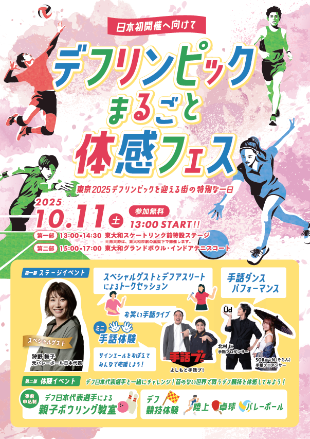 大会が始まる前にデフスポーツやサインエール(手話による応援)が体験できる「デフリンピックまるごと体感フェス」を開催します。
