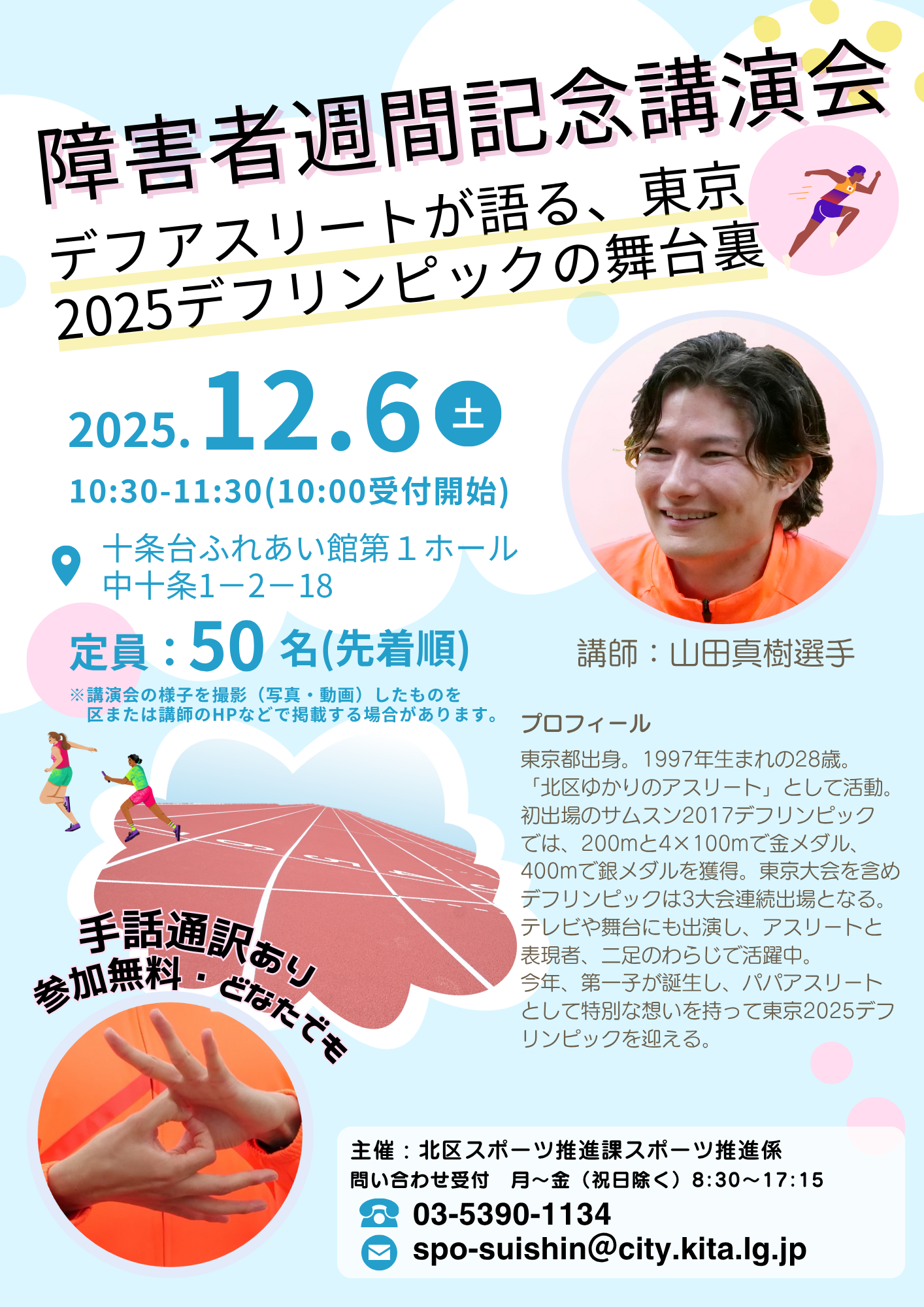 2025年の内容は、東京2025デフリンピック(2025年11月)の閉幕に合わせ、現役デフアスリートの山田真樹選手にお越しいただき、「デフアスリートが語る、東京2025デフリンピックの舞台裏」というテーマに沿って、大会のレガシーを会場の皆様に伝えていただきます。