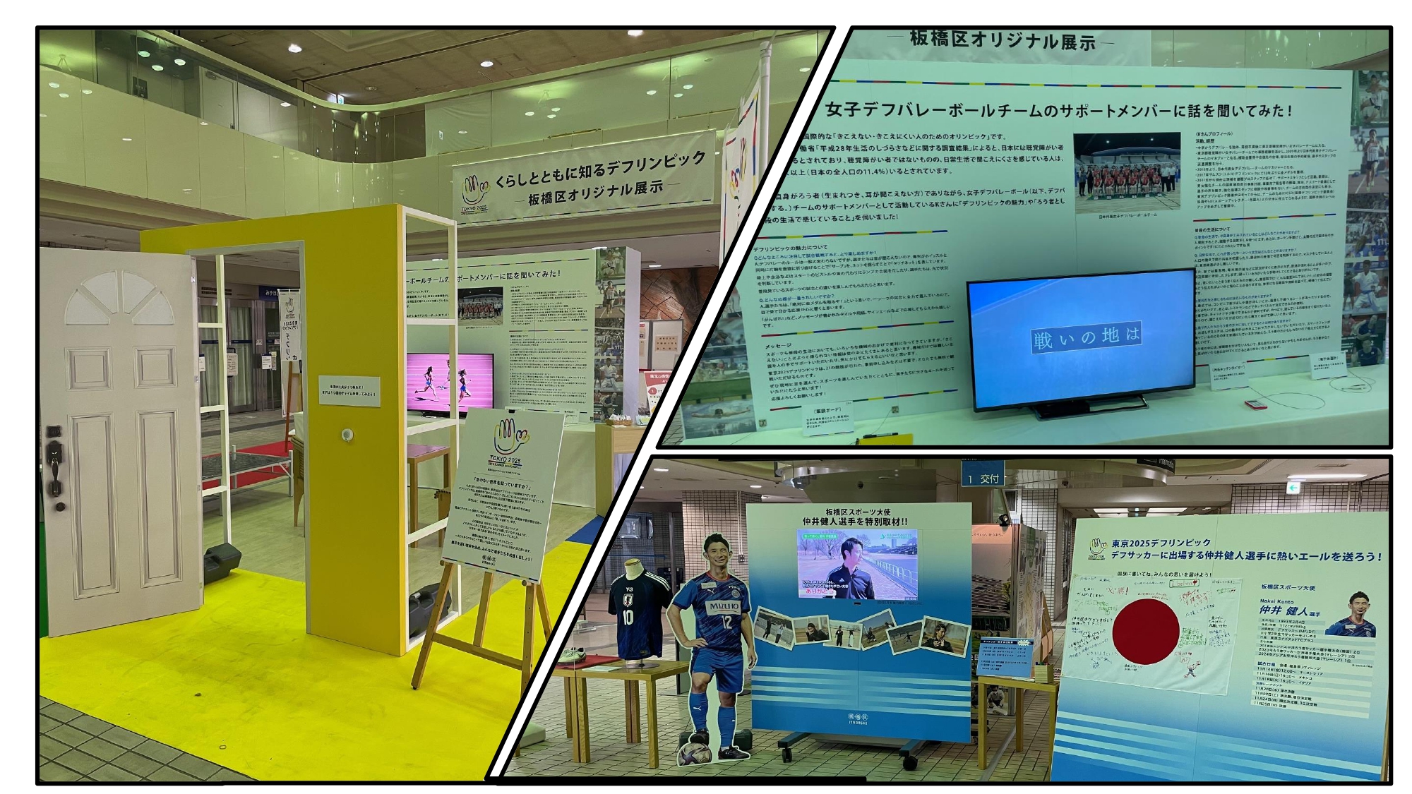 板橋区スポーツ大使であり、デフサッカー日本代表としてデフリンピックに出場する「仲井健人選手」の等身大パネル、過去大会着用スパイク等に加え、音がない世界を体験できるブースやデフリンピックに出場される選手に応援メッセージを記載できる国旗も設置し、来場者が大会・競技への理解を深めることができるイベントとなっております。これを機会に、板橋区ゆかりの選手について知り、デフリンピックでの活躍を応援しましょう。
