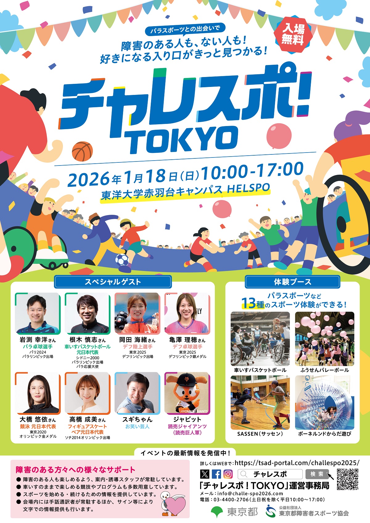 パリ2024パラリンピック卓球日本代表の岩渕 幸洋(いわぶち こうよう)さんや東京2025デフリンピックにも出場したアスリートなど、多くのゲストがステージ企画や競技体験ブースに登場します。お笑い芸人スギちゃんやプロスポーツチームのマスコットも一緒にイベントを盛り上げます。ぜひご来場いただき、パラスポーツの魅力を体感してください。